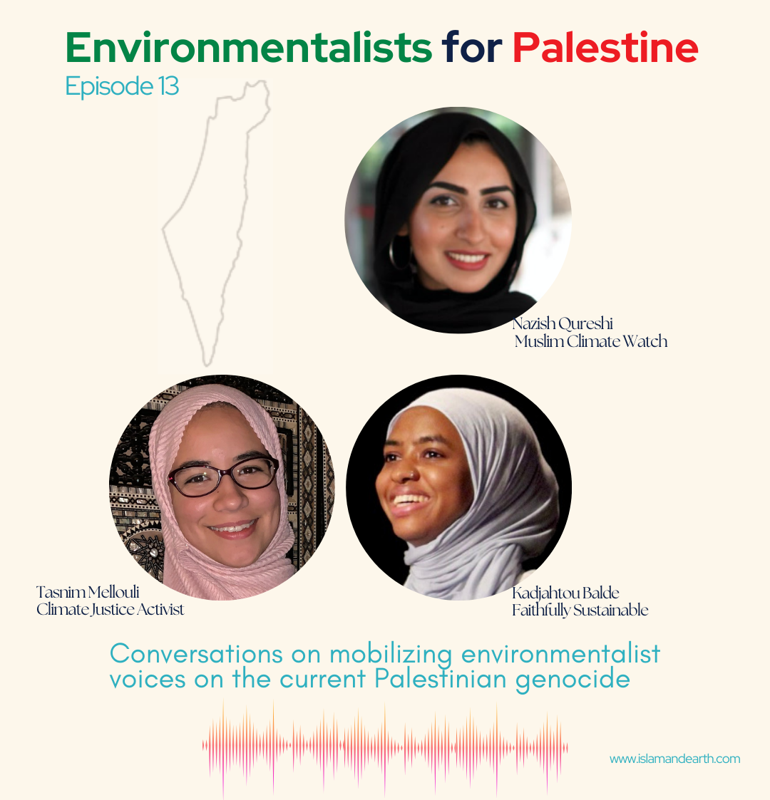 In this special LIVE recorded episode of Islam & Earth, three guests: Nazish Qureshi (Muslim Climate Watch); Kadjahtou Balde (Faithfully Sustainable); and Tasnim Mellouli (Climate Justice Activist) join for a very critical conversation on climate justice and Palestinian justice issues.